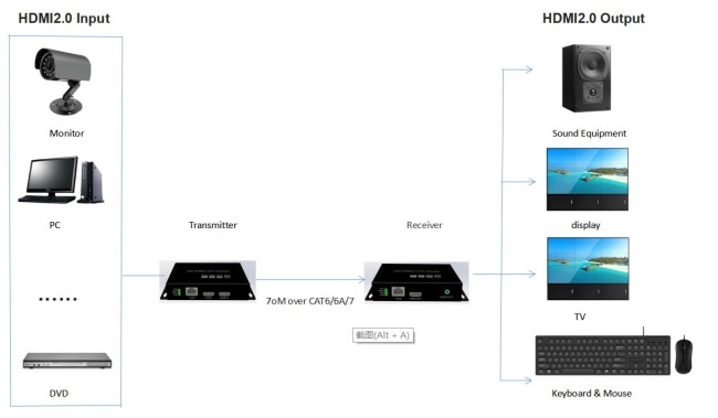 HDMI2.0 Extender over CAT6 or CAT6A/7 extends 4K 60Hz 4:4:4 HDMI 2.0 signals to remote places, point-to-point transmission mode supports transmitter 1 channel HDMI2.0 input and 1 channel loop,Receiver 1 channel HDMI2.0 output and 1 channel audio output. It can extend HDMI 2.0 video signals up to 70 meters and transmit them over CAT6 cables at 4K 60Hz resolution. High bandwidth, no latency, remote playback of real-time HD video. It is widely used in computing and surveillance systems, big screen advertisement system, video wall, bank, stock market, education system etc.