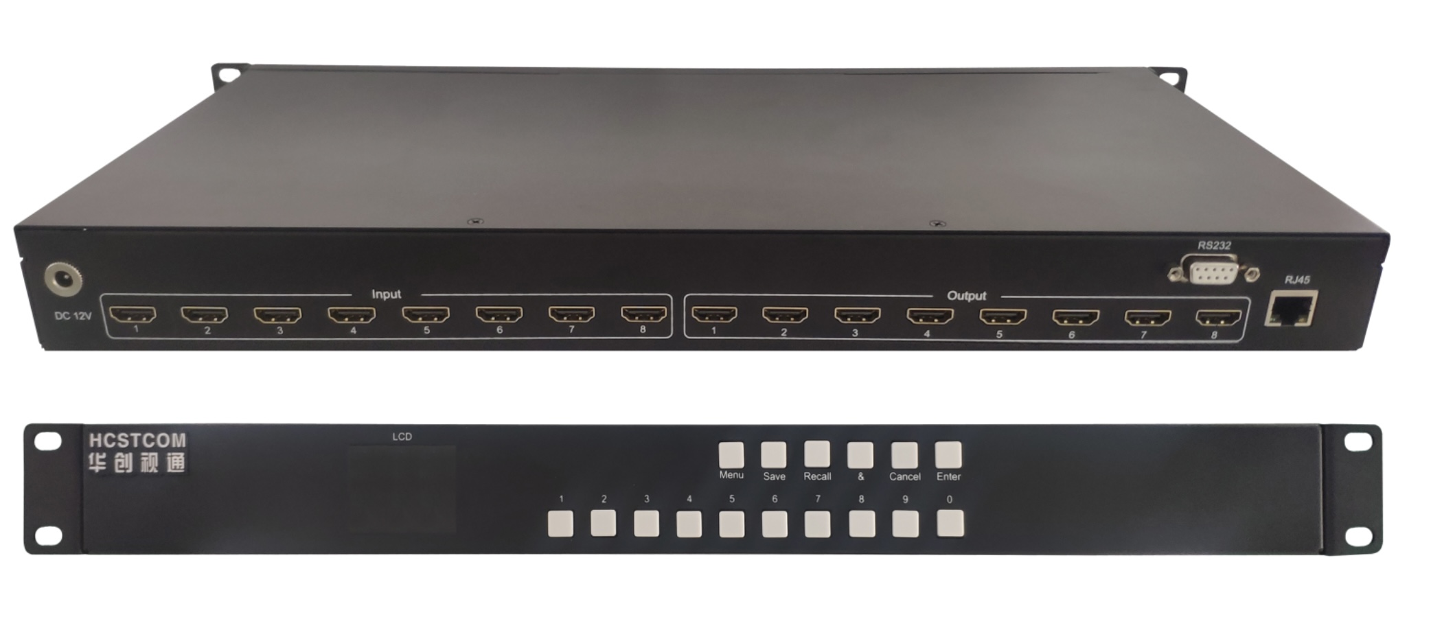 The HDMI2.0 8*8 matrix switcher, researched and developed by Beijing HCSTCOM Co.,Ltd, Support 8 channels 4K60 HDMI video signal input, 8 channels 4K60 HDMI video signal, can be any input video signal, switch to any output interface; The product is widely used in large screen projection display engineering, large screen splicing, audio-visual teaching, command and control center, multimedia conference room and other occasions