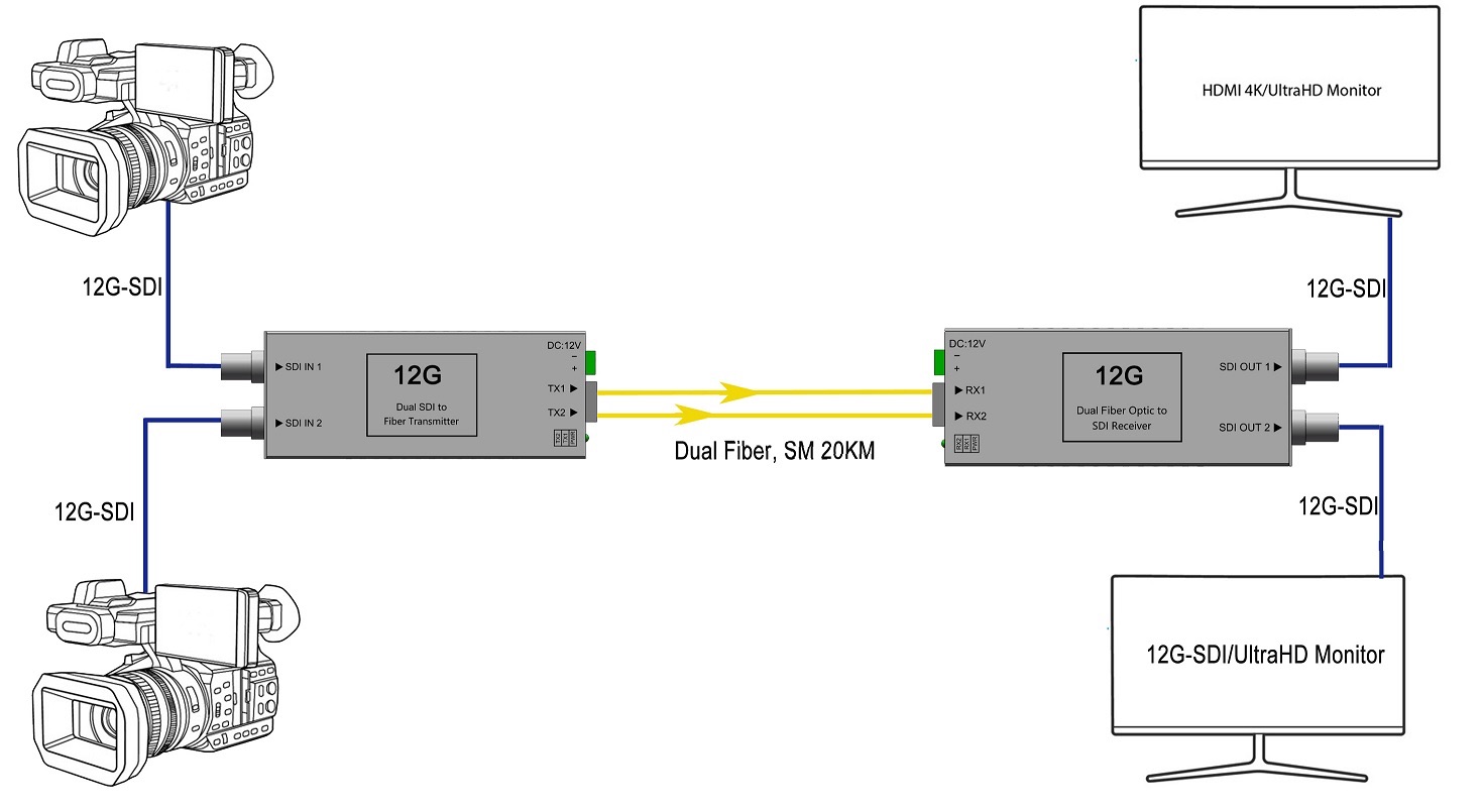 The 2-channel 12G-SDI optical transceiver developed and produced by Beijing Hcstcom transmits 2-channel 12G-SDI video signals through 2-core single-mode optical fiber, and the transmission distance can reach 20-80KM. Compatible with 6G/3G/HD-SDI video signals, it is broadcast-level that support clock recovery function. It is widely used in broadcast television stations, OB vans, medical operating rooms, video conference systems, command centers and other places.
